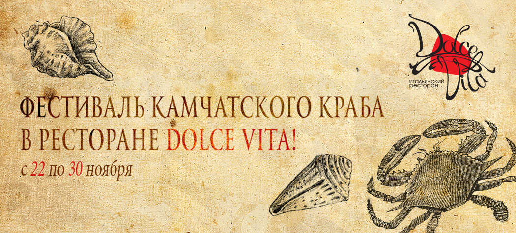Только в последнюю неделю ноября ресторан Dolce Vita предлагает вам поистине разнообразный выбор блюд, рецепты которых были созданы шеф-поваром Витторио Соверина исключительно для фестиваля камчатского краба – разумеется, в сочетании с лучшими итальянскими и французскими винами от нашего сомелье и в привычной атмосфере тепла и уюта в самом сердце города.