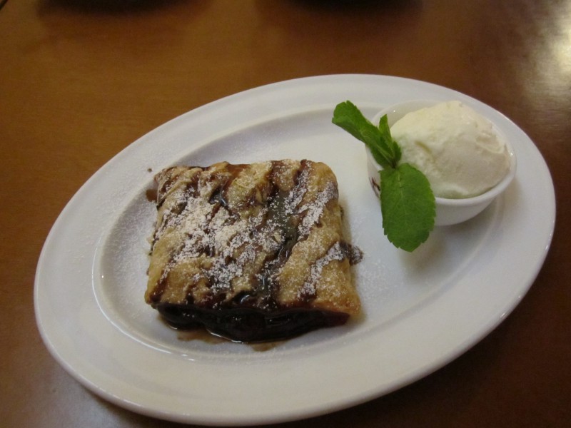 Что ел и пил? Поначалу капучино с карамелью, немного Старого Крыма. Традиционно выбрал салатик Инсалата ди карбонара - легкий и вполне сытный. Не смог по случаю новоселью кафе отказать себе в супчике с домашней лапшой. На горячее была чудная бистека из говядины - очень рекомендую. Завершилось всё дегустацией вишневого штруделя с шариком мороженого.