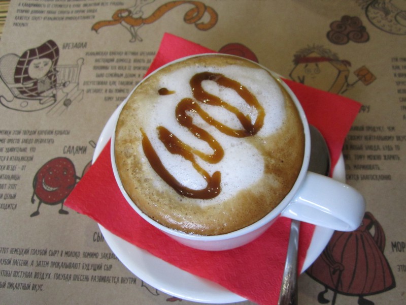 Сел в своём любимом уголке. Хорошо, что не был занят. Народу в зале хватало - непрерывно приходили и уходили, особенно много людей приходят по-семейному с детьми. Но пора уже поговорить и про еду. Тем более, что уже и кофе удалось продегустировать. Постарались мне чего-то нарисовать на поверхности чашки. Что получилось, то получилось, но главное, конечно, что старались - Спасибо!!!