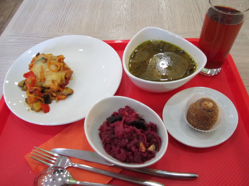 На раздаче есть всё - весьма удобно, быстро, демократично. Обо всём, если спросить расскажут и готовы рассказать даже раньше, чем вы спросите. Не лишний момент, если учесть, что в вегетарианской кухне мы как-то не слишком хорошо разбираемся. Подносик собрал быстро, оплатил безналом. В сравнении со средней ценой добавьте ещё столько же, вот и получим искомое или около того.
